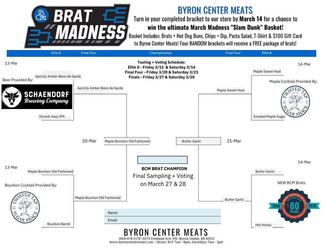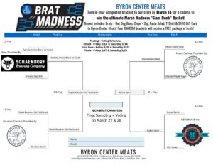 Customers fill out a BCM Brat Bracket with their predicted winners (print this off at home or fill one out in-store!) Turn your bracket in by March 14βin-store only.